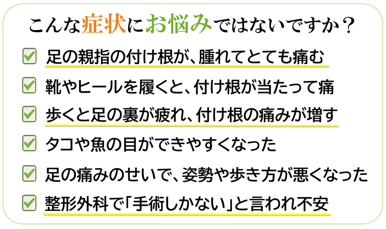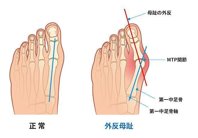 多くの場合、親指の付け根の突出部分が靴に当たって痛みや炎症を引き起こし、悪化すると歩行障害やタコ・魚の目などの原因になります。