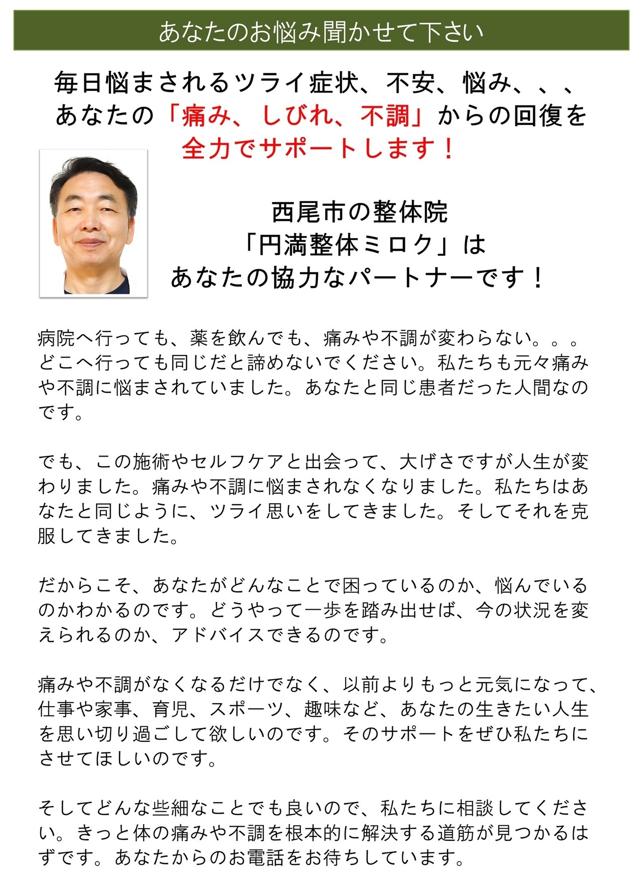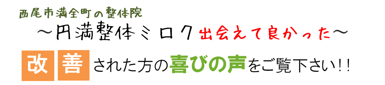 →某整体の施術を受けたときに円満整体ミロクさんを紹介してくれました。きっと円満整体ミロクさんの施術なら祖母が良くなると思うのでぜひ行ってほしいとおっしゃって下さったのがきっかけでお伺いしました。