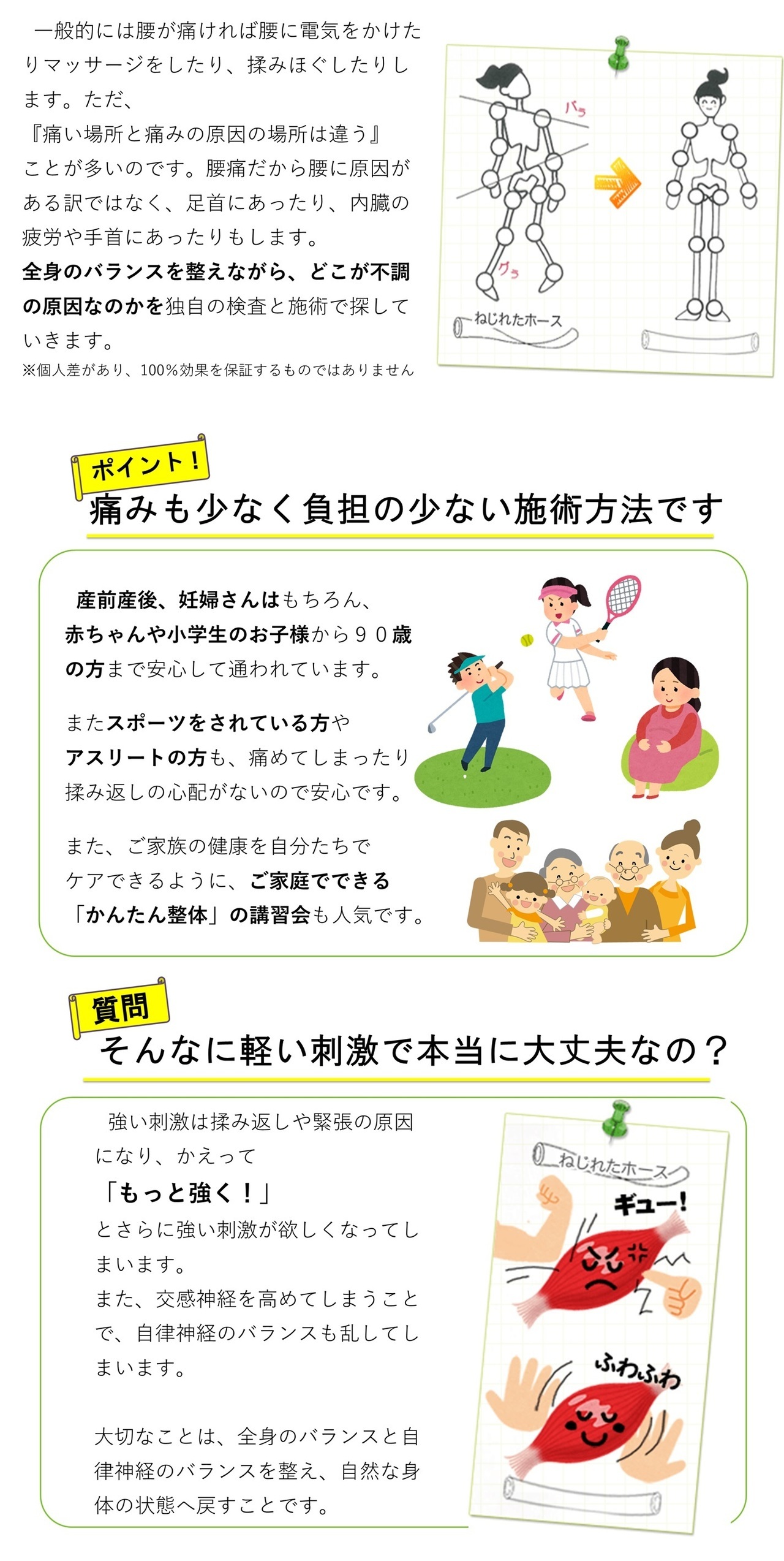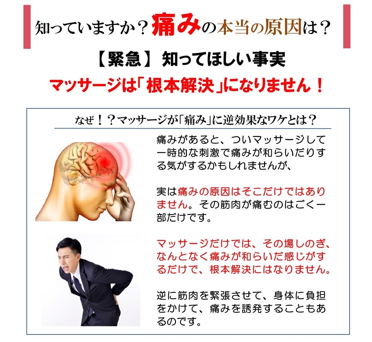 痛い部分だけを治療していましたが、腰が治れば背中。背中の痛みが取れれば肩やまた腰と、ずっと痛みが回っていました。